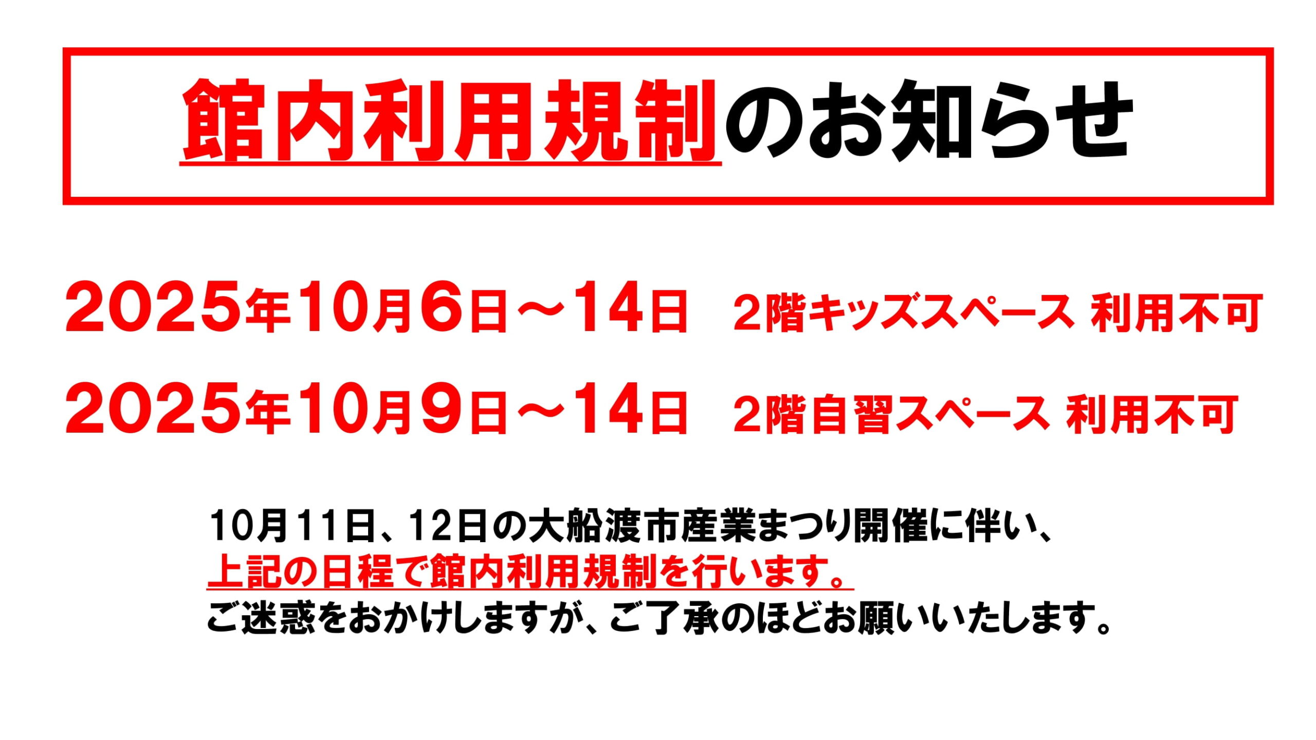 10月11日、12日の大船渡市産業まつり開催に伴い、上記の日程で館内利用規制を行います。