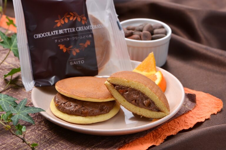 バタークリームに3種類のチョコをブレンドし、オレンジリキュールとオレンジピールを入れたチョコバタークリームのどら焼です!! ほのかに香るオレンジの香りが上品です♪