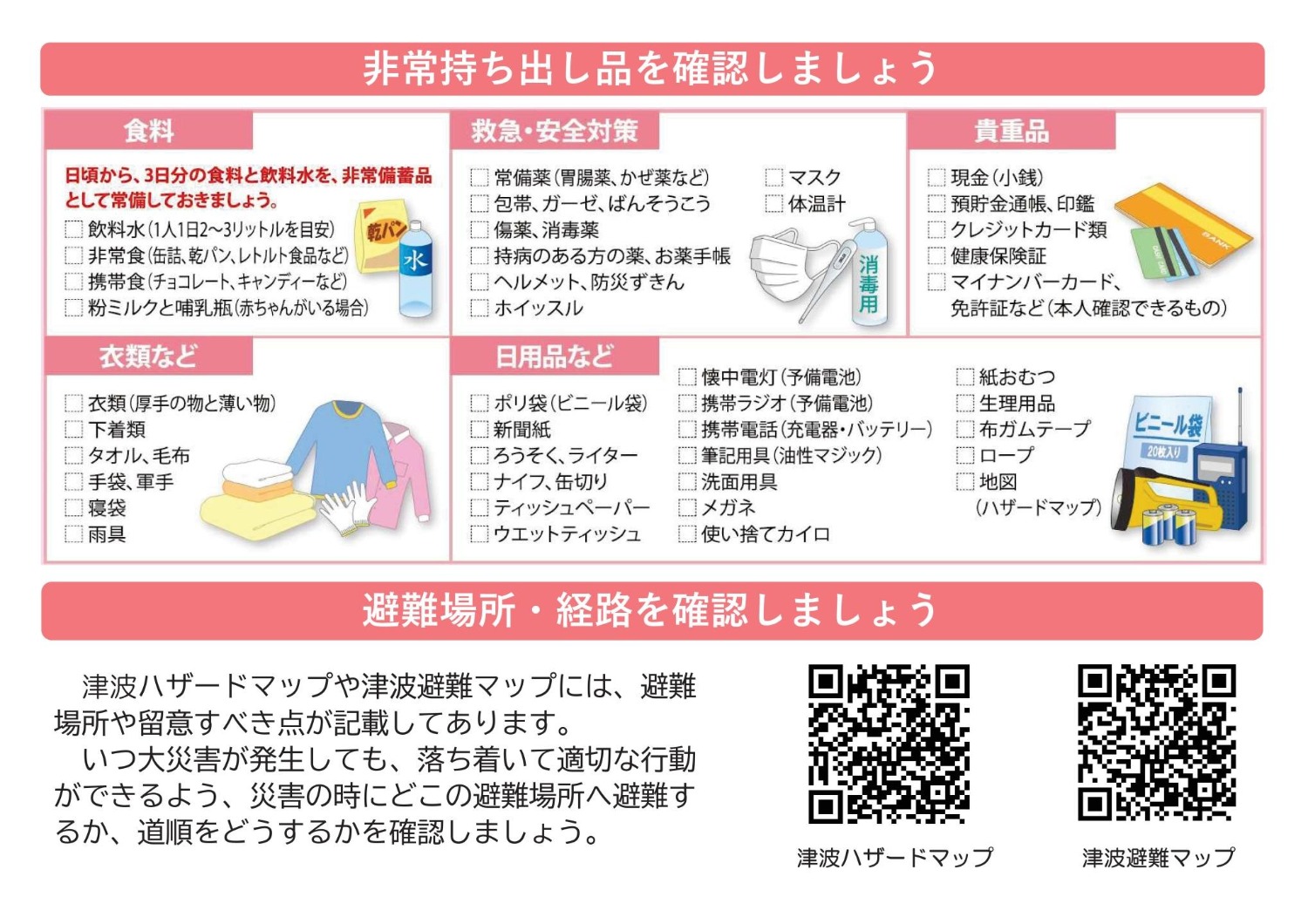1週間程度、すぐに避難できる態勢の準備など、地震や津波が発生したときの備えを再確認しましょう。
