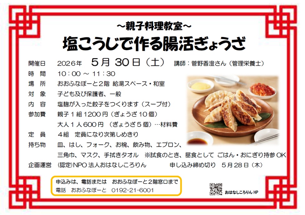 参加費 親子 1組 1200円(ぎょうざ10個)